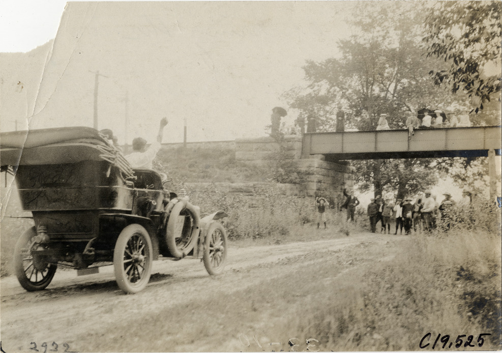 View of spectators at railroad bridge cheering motorists in approaching car during the 1906 Glidden Tour. Stamped on back: "Photo by N. Lazarnick, 29 West 42nd Street, New York." Handwritten on back: "Natives cheering the tourists and throwing flowers in the cars as they pass under the bridge. Tours--Glidden Tour, 1906."