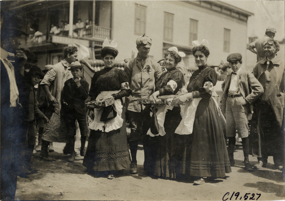 View of driver posing with three nurses during the 1906 Glidden Tour. Nurses hold trays of flowers, which were sold for charity. Stamped on back: "Photo by N. Lazarnick, 29 West 42nd Street, New York." Handwritten on back: "The nurses who were selling flowers to the automobilists for charity. Tours--Glidden Tour, 1906."