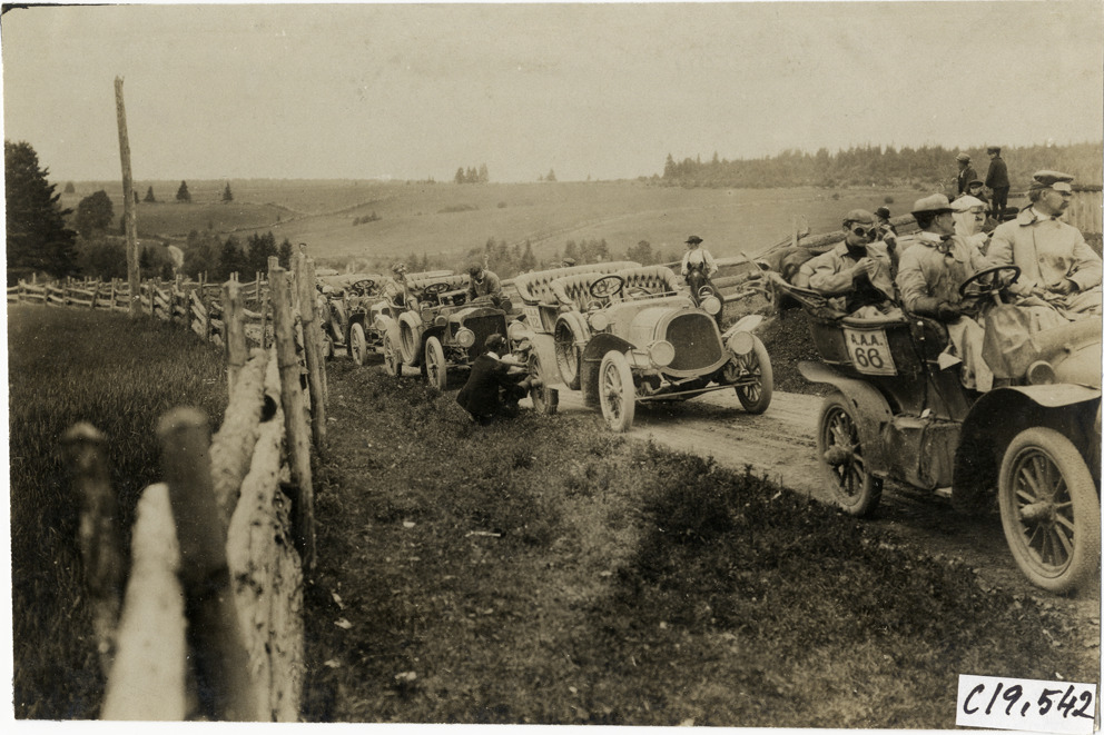 Favorite this☆ Automobiles lined up in road, 1906 Glidden Tour Description: View of cars lined up in road during the 1906 Glidden Tour. Man repairs tire on car no. 12. Handwritten on back: "A stop to repair tires. Tours--Glidden Tour, 1906." Details Resource ID: na022120 Subject: Automobiles Automobiles--Tires--Maintenance and repair Glidden Tour (1906) Automobile driving--Competitions Photographic prints Date Issued: 1906-07 Format: 1 photographic print ; 4.5 x 6.5 in. Member of: National Automotive History Collection Lazarnick Collection Filing Location: Tours--Glidden Tour, 1906 #38 Negative Number: Negative #C19,542 Rights: Physical rights are retained by DPL. Copyright is retained in accordance with U.S. copyright laws.
