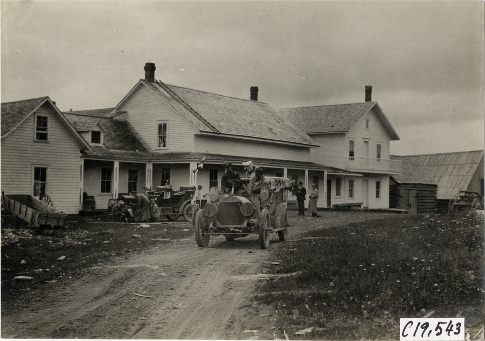 View of driver and passengers in car at the United States-Canada border during the 1906 Glidden Tour. Wooden-frame building in background. Stamped on back: "Photo by N. Lazarnick, 29 West 42nd Street, New York." Handwritten on back: "At the boundary line between U.S. & Candia [sic]. Tours--Glidden Tour, 1906."