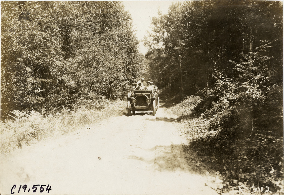 View of motorists in car traveling on rural dirt road during the 1906 Glidden Tour. Stamped on back: "Photo by N. Lazarnick, 29 West 42nd Street, New York." Handwritten on back: "Tours--Glidden Tour, 1906."