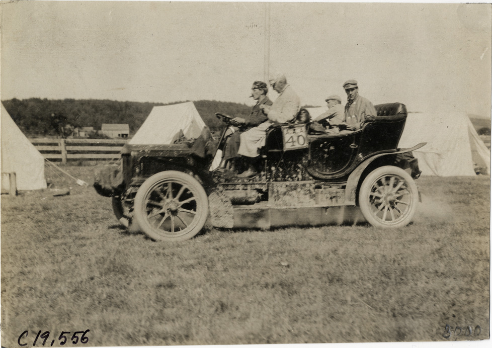 View of driver and passengers in car no. 40 during the 1906 Glidden Tour. Tents in background. Handwritten on back: "Preparing to start on the days run. Tours--Glidden Tour, 1906."