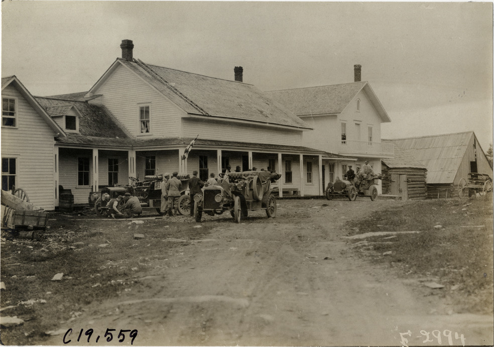 View of motorists with cars at the United States-Canada border during the 1906 Glidden Tour. Wooden-frame building in background. Stamped on back: "Photo by N. Lazarnick, 29 West 42nd Street, New York." Handwritten on back: "Tours--Glidden Tour, 1906."
