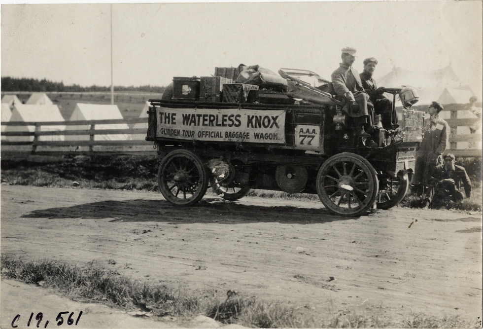 View of driver and passenger in Knox truck, loaded with luggage, arriving at Waterville, Maine during the 1906 Glidden Tour. Signs on truck read: "The waterless Knox, Glidden Tour official baggage wagon, A.A.A. 77." Tents in background. Stamped on back: "Photo by N. Lazarnick, 29 West 42nd Street, New York." Handwritten on back: "Arriving at Waterville. Tours--Glidden Tour, 1906."