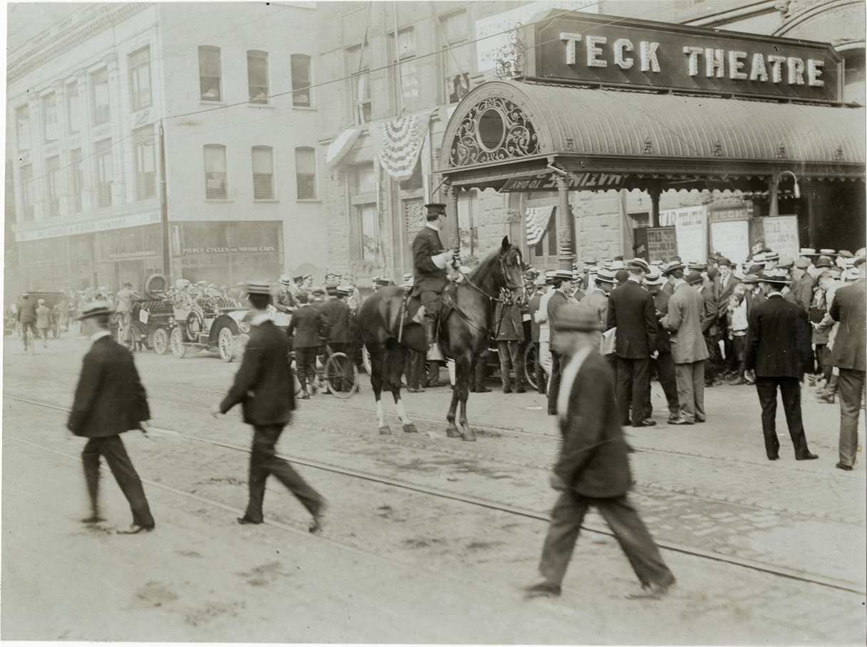Crowd and mounted policeman in front of Teck Theatre at Buffalo, New York, 1906 Glidden Tour