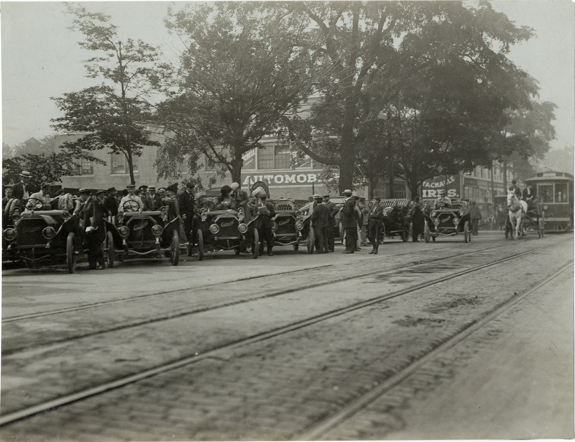 View of motorists with Oldsmobile cars in street at Buffalo, New York during the 1906 Glidden Tour. Handwritten on back: "Olds cars at Buffalo. Tours--Glidden Tour, 1906."