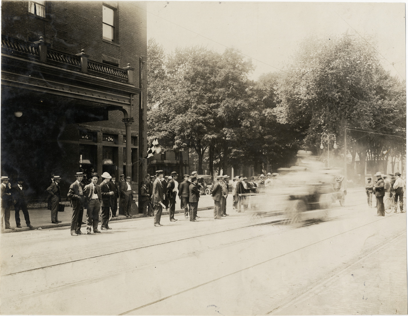 Favorite this☆ Automobile passing spectators, 1906 Glidden Tour Description: Blurred view of car passing group of spectators during the 1906 Glidden Tour. Commercial buildings in background. Handwritten on back: "Tours--Glidden Tour, 1906." Details Resource ID: na022159 Subject: Spectators Glidden Tour (1906) Automobile driving--Competitions Photographic prints Date Issued: 1906-07 Format: 1 photographic print ; 7.5 x 9.5 in. Member of: National Automotive History Collection Lazarnick Collection Filing Location: Tours--Glidden Tour, 1906 #39 Rights: Physical rights are retained by DPL. Copyright is retained in accordance with U.S. copyright laws.
