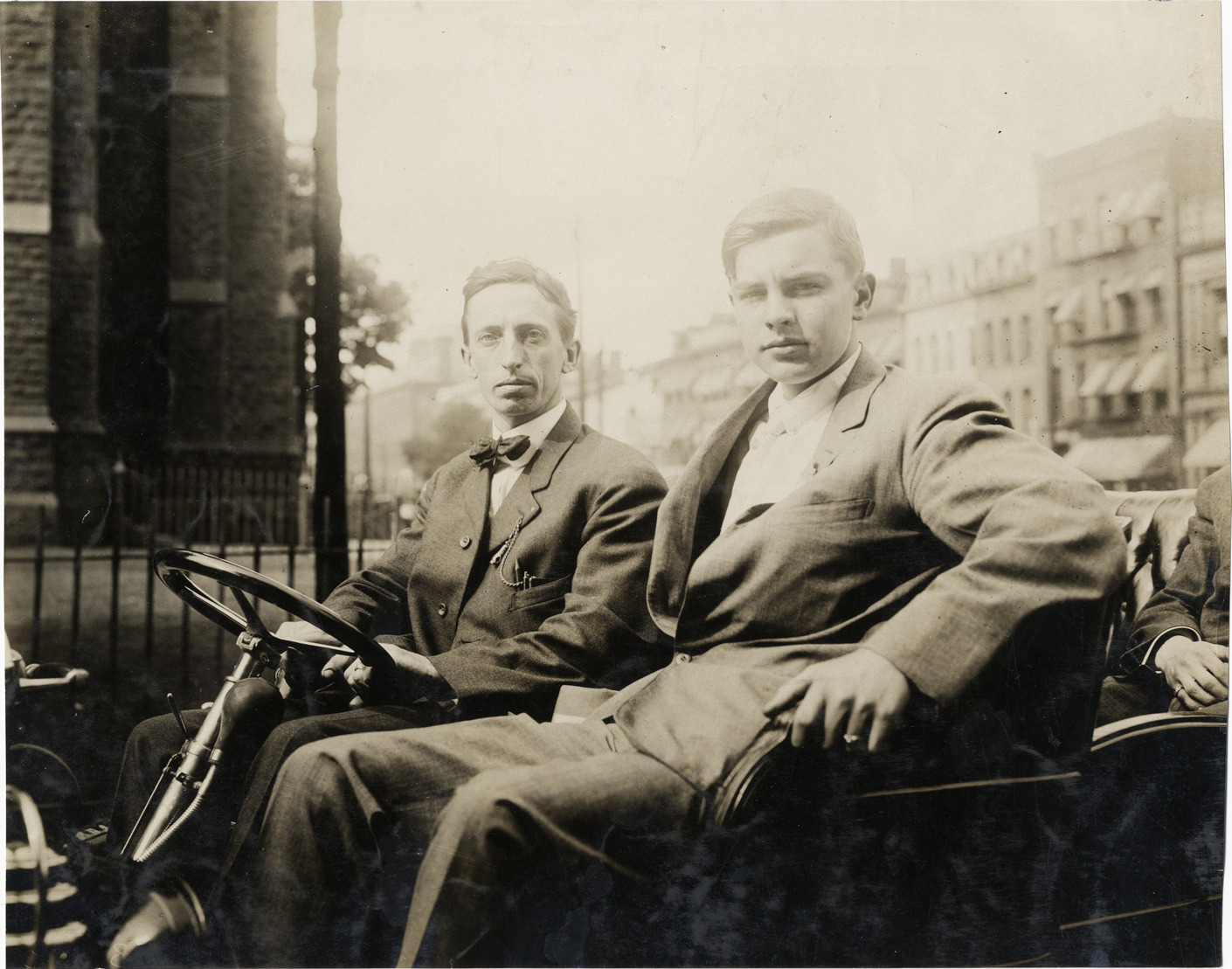 Close-up view of I.C. Kirkham and passenger in Maxwell car during the 1906 Glidden Tour. Handwritten on back: "I.C. Kirkham, 16 h.p. Maxwell. Tours--Glidden Tour, 1906."