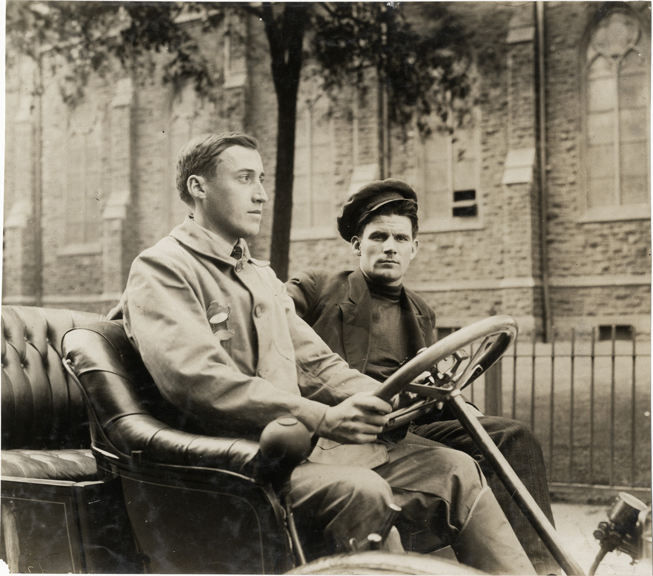 Close-up view of driver and passenger during the 1906 Glidden Tour. Handwritten on back: "Tours--Glidden Tour, 1906."