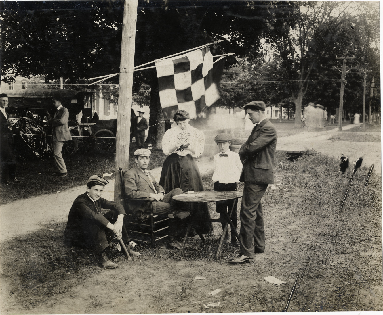 Favorite this☆ Checking station, 1906 Glidden Tour Description: View of three men, a woman and a boy standing around table at checking station during the 1906 Glidden Tour. Checkered flag is displayed on pole. Handwritten on back: "Checking station. Tours--Glidden Tour, 1906." Details Resource ID: na022199 Subject: Sports officials Flags Glidden Tour (1906) Automobile driving--Competitions Photographic prints Date Issued: 1906-07 Format: 1 photographic print ; 7.25 x 9 in. Member of: National Automotive History Collection Lazarnick Collection Filing Location: Tours--Glidden Tour, 1906 #41 Rights: Physical rights are retained by DPL. Copyright is retained in accordance with U.S. copyright laws.