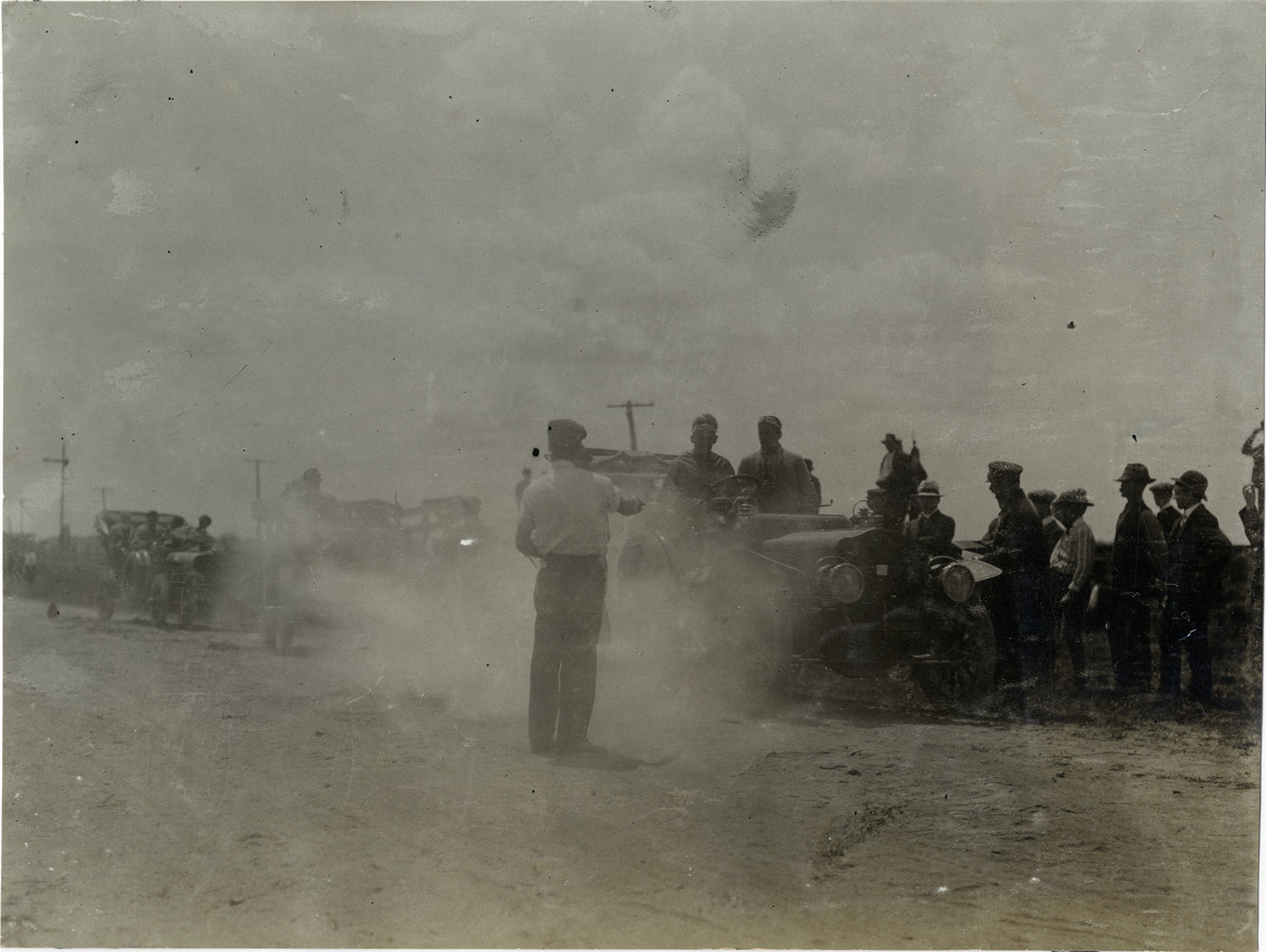 View of motorists in cars lined up in road during the 1906 Glidden Tour. Man stands in foreground. Stamped on back: "F. Ed. Spooner, and Chas. S. Wells. Motor News, Motor Photos, Motor Adv, 1536 B'way, New York. Tel 6536-38th St." Handwritten on back: "Tours--Glidden Tour, 1906."