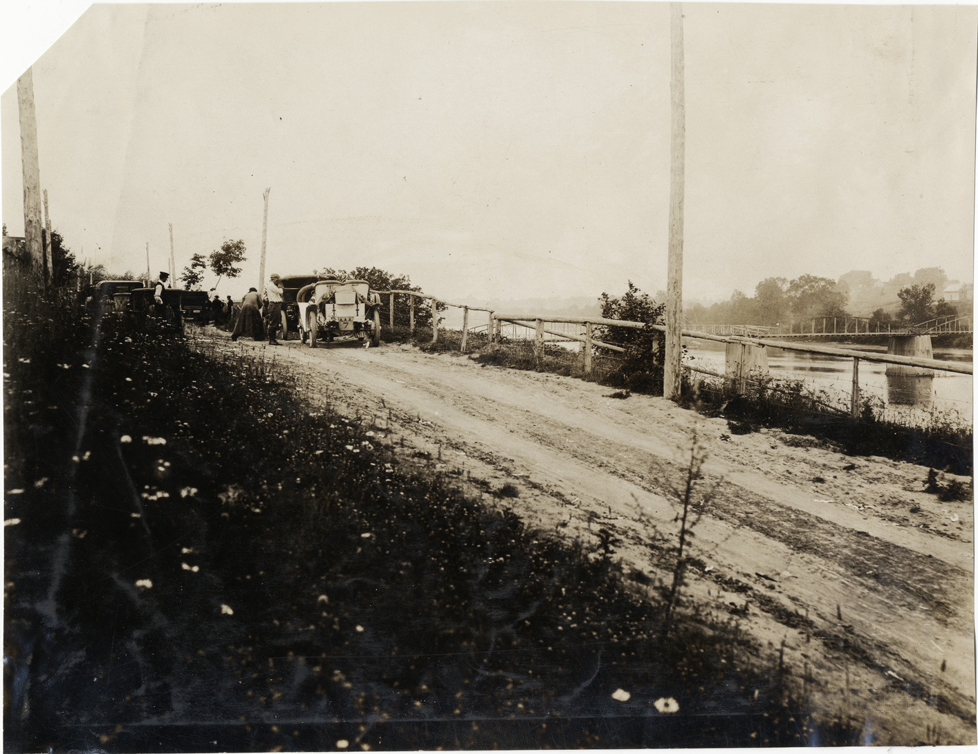 View of motorists with cars on the side of a rural dirt road during the 1906 Glidden Tour. River and bridge in background. Stamped on back: "F. Ed. Spooner, and Chas. S. Wells. Motor News, Motor Photos, Motor Adv, 1536 B'way, New York. Tel 6536-38th St." Handwritten on back: "Tours--Glidden Tour, 1906."