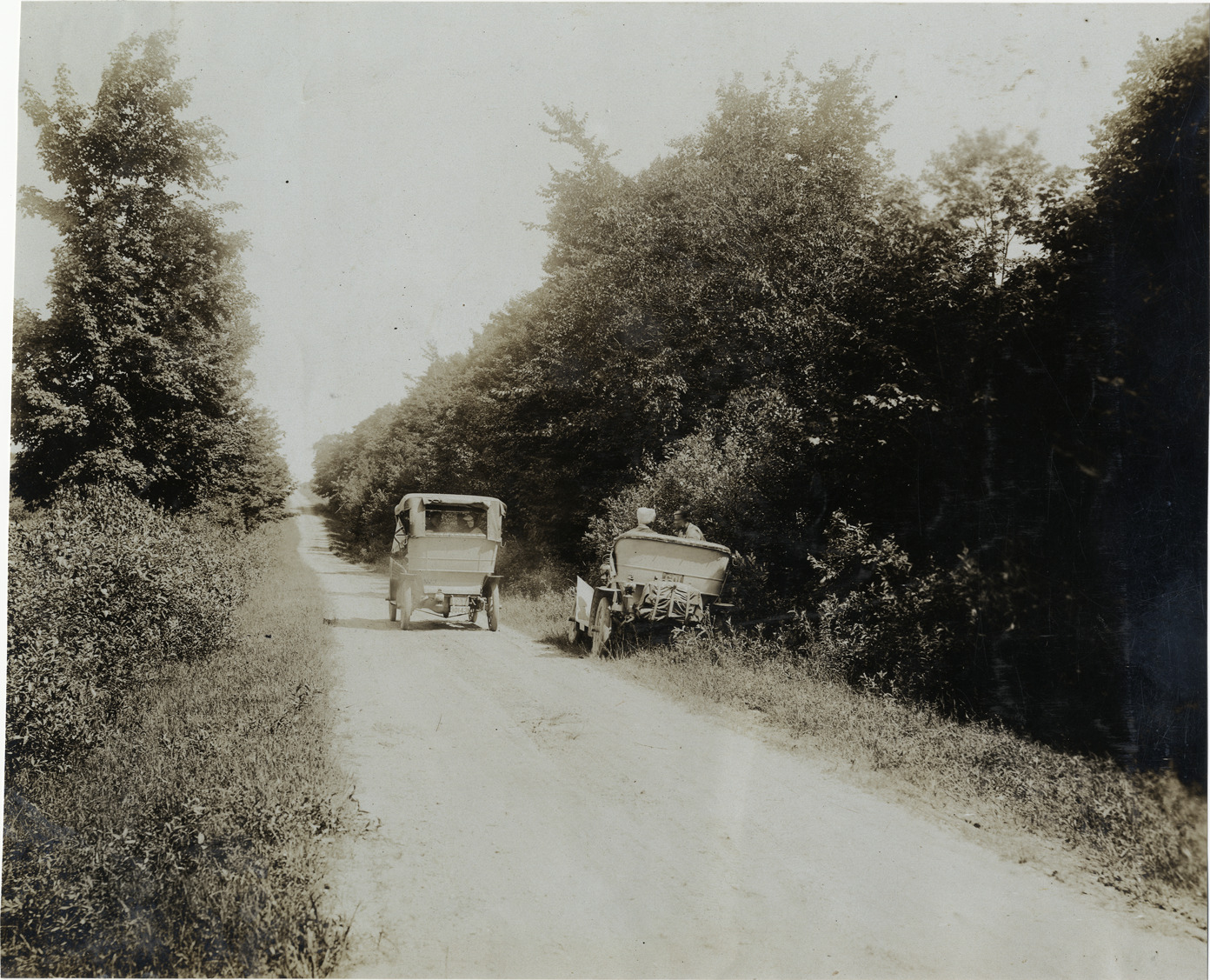 Rear view of two cars on rural dirt road during the 1906 Glidden Tour. Handwritten on back: "Tours--Glidden Tour, 1906."
