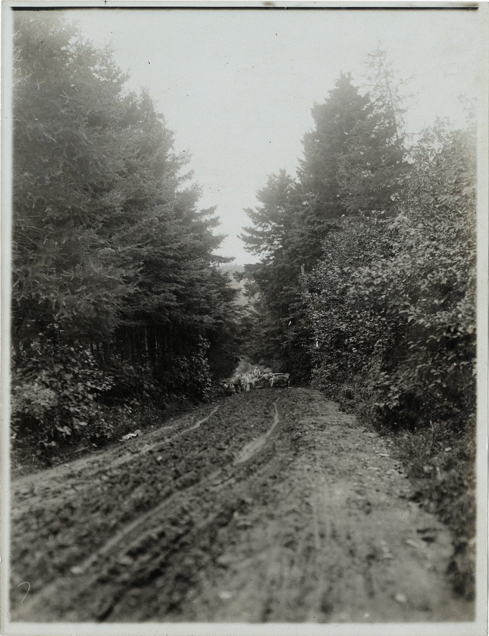 Distant view of motorists with cars on rural dirt road during the 1906 Glidden Tour. Handwritten on back: "Tours--Glidden Tour, 1906."