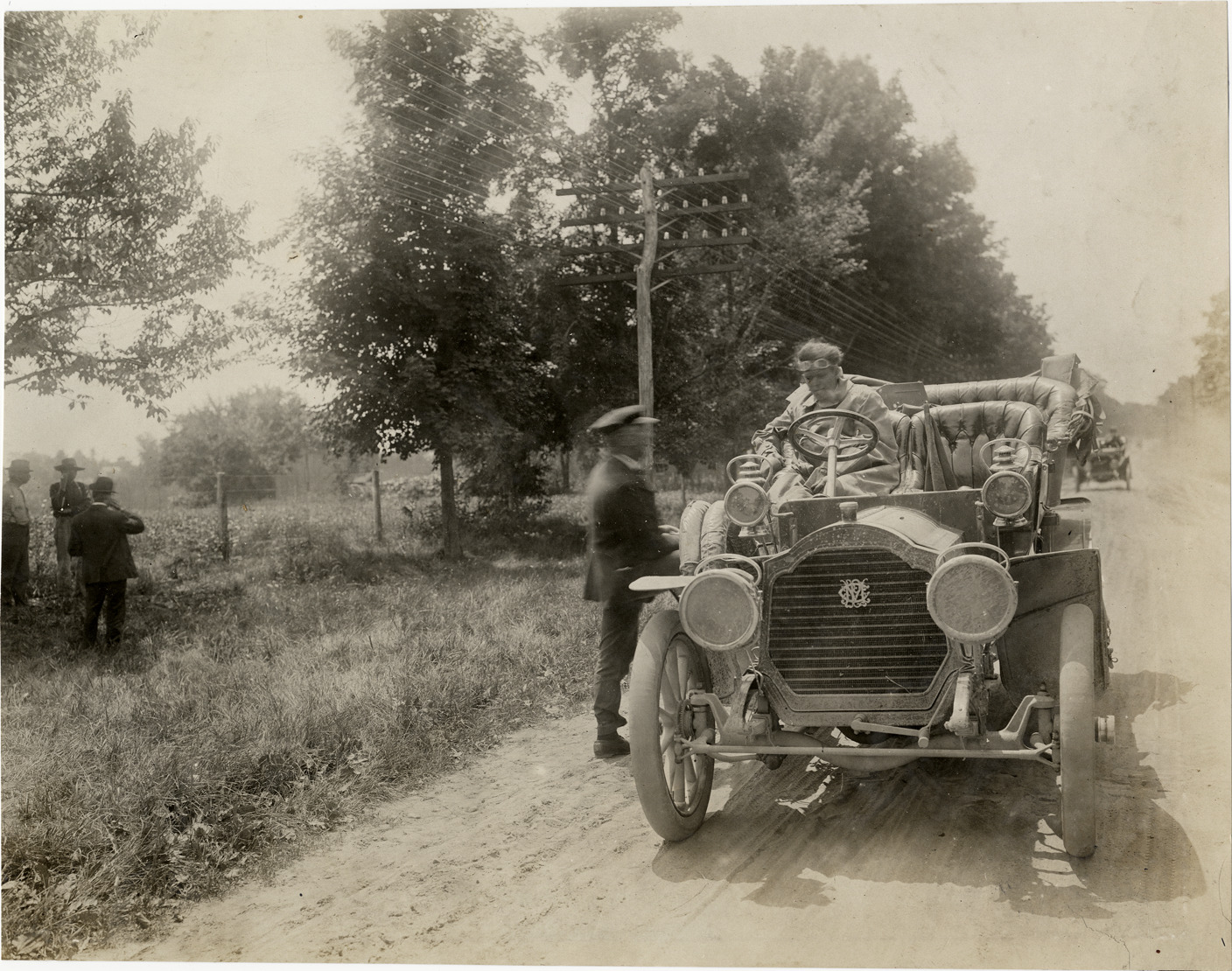 View of driver (passenger was photographer F. Ed. Spooner) being arrested in Lima, New York during the 1906 Glidden Tour. Man stands next to car. Several Glidden participants were arrested and fined as part of a police trap. Handwritten on back: "Arrest of F. Ed. Spooner. Tours--Glidden Tour, 1906."