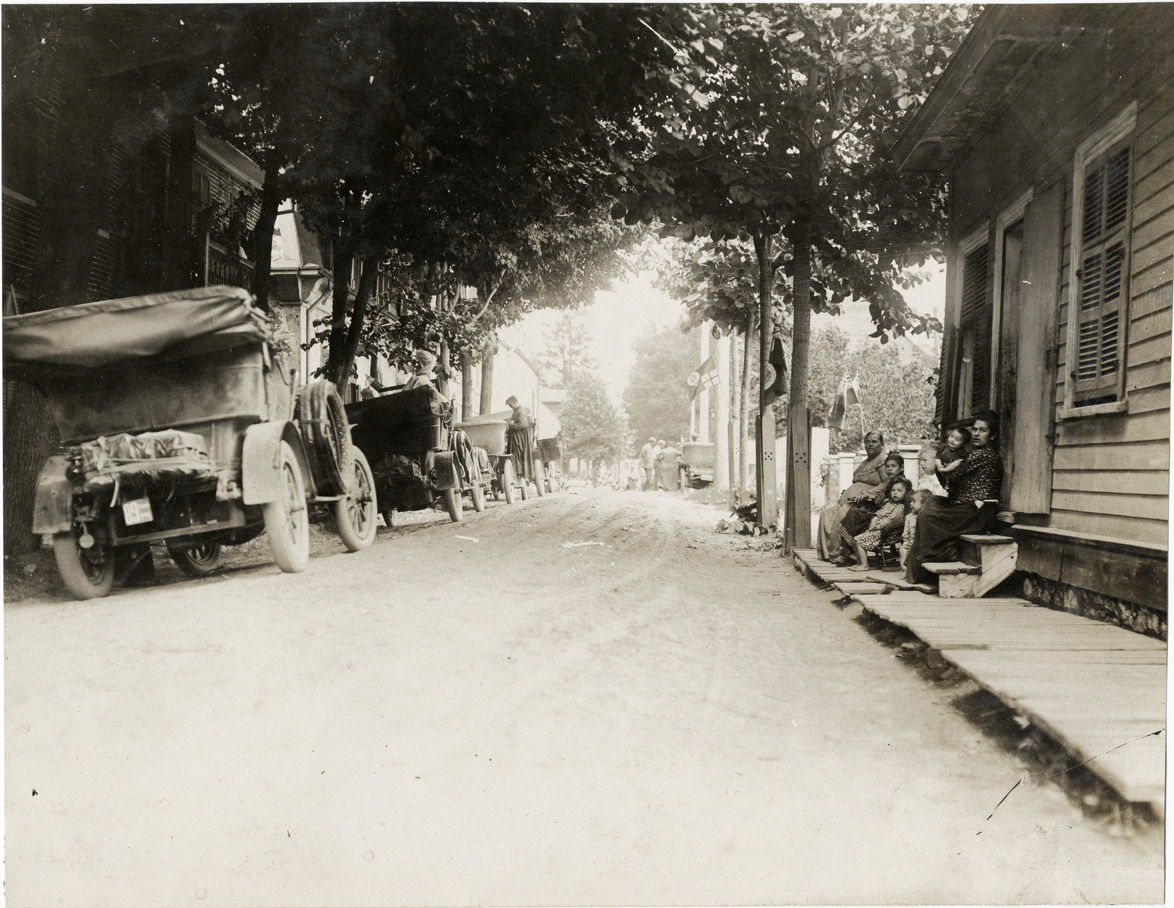 Rear view of cars lined up in street during the 1906 Glidden Tour. Women and children sit on stoop in front of house on right. Handwritten on back: "Tours--Glidden Tour, 1906."