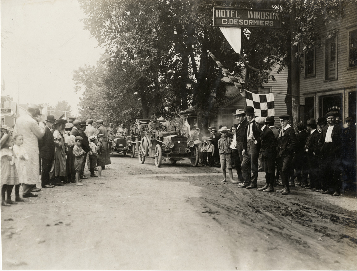 View of spectators and cars at checking station outside of Montreal, Quebec during the 1906 Glidden Tour. Hotel Windsor on right. Handwritten on back: "Checking station outside of Montreal. Tours--Glidden Tour, 1906."