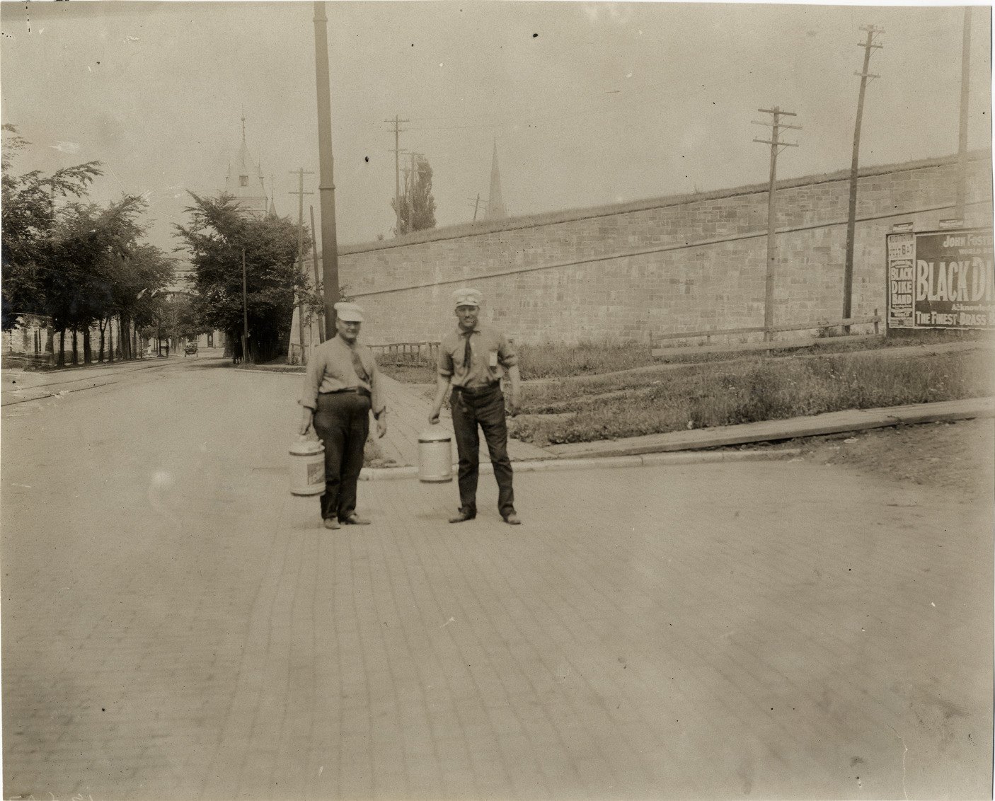 View of two men carrying metal containers at Quebec City during the 1906 Glidden Tour. Stone wall in background. Stamped on back: "F. Ed. Spooner, and Chas. S. Wells. Motor News, Motor Photos, Motor Adv, 1536 B'way, New York. Tel 6536-38th St." Handwritten on back: "Tours--Glidden Tour, 1906."