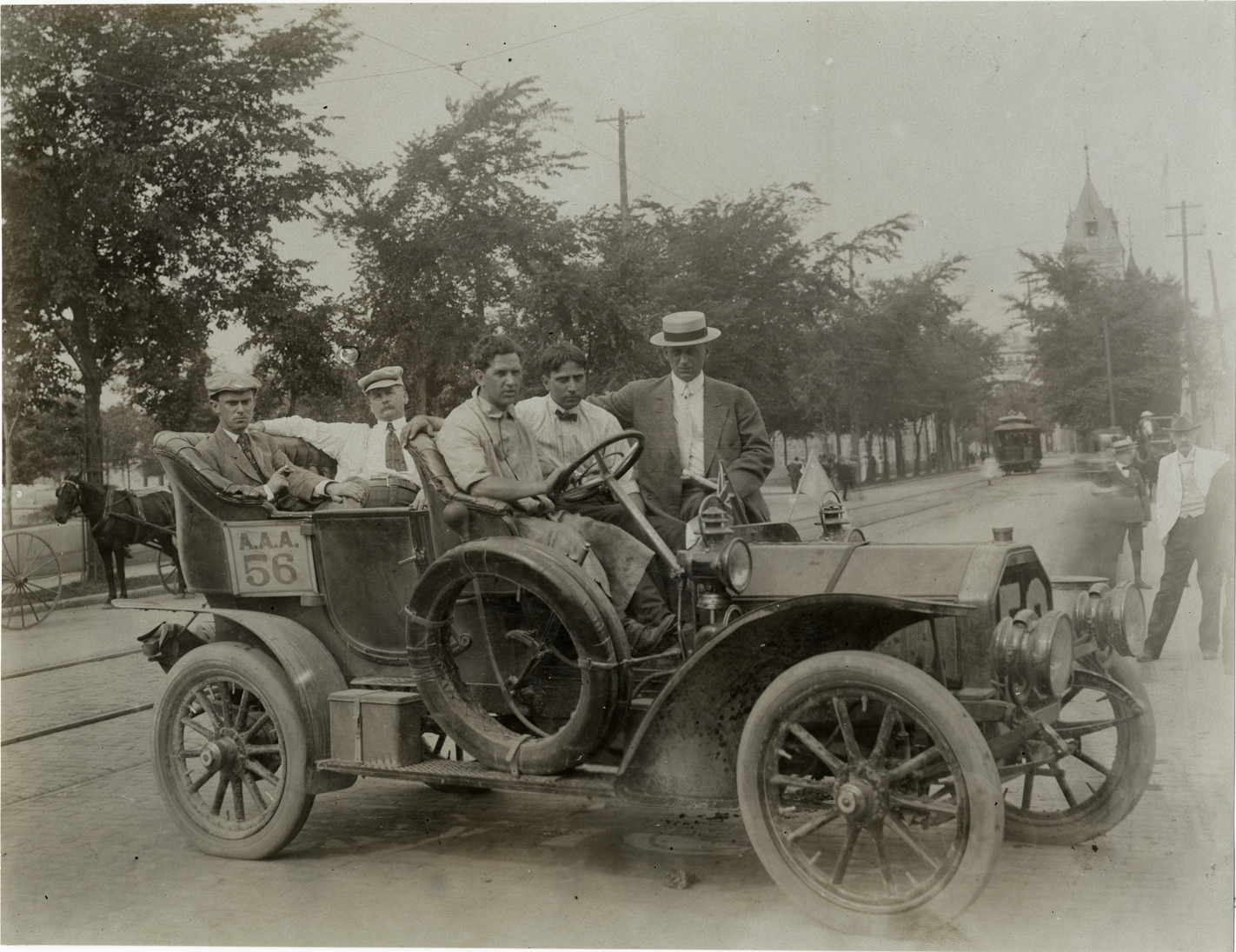View of driver and passengers in car no. 56 at Quebec City during the 1906 Glidden Tour. Stamped on back: "F. Ed. Spooner, and Chas. S. Wells. Motor News, Motor Photos, Motor Adv, 1536 B'way, New York. Tel 6536-38th St." Handwritten on back: "Tours--Glidden Tour, 1906."