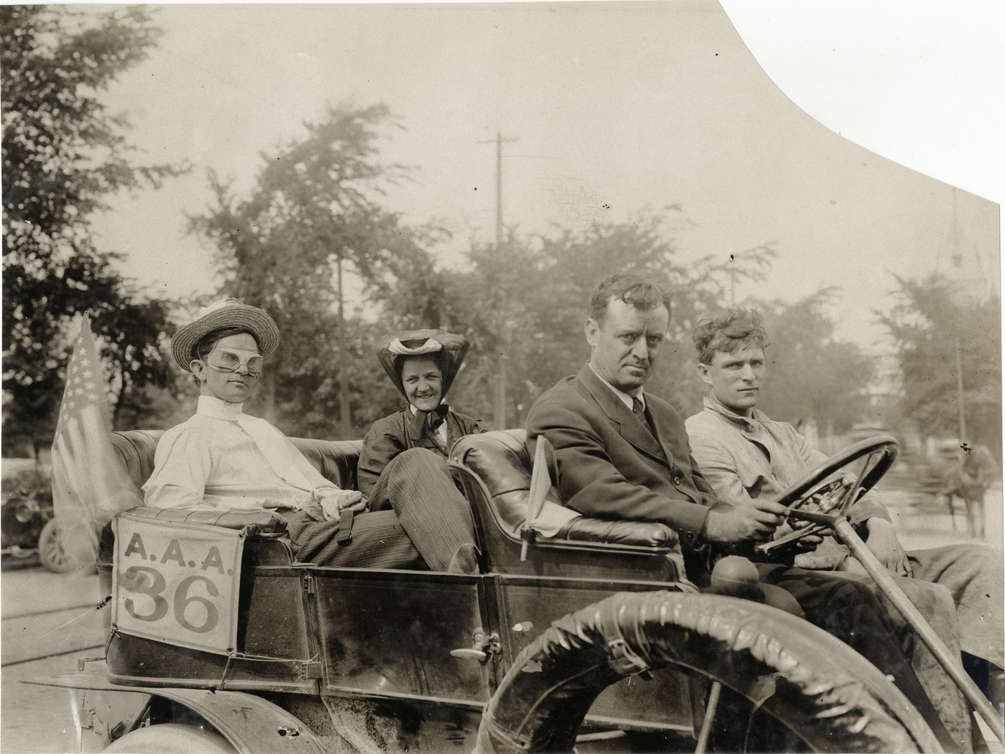 Close-up view of driver and passengers in car no. 36 at Quebec City during the 1906 Glidden Tour. Stamped on back: "F. Ed. Spooner, and Chas. S. Wells. Motor News, Motor Photos, Motor Adv, 1536 B'way, New York. Tel 6536-38th St." Handwritten on back: "Tours--Glidden Tour, 1906."