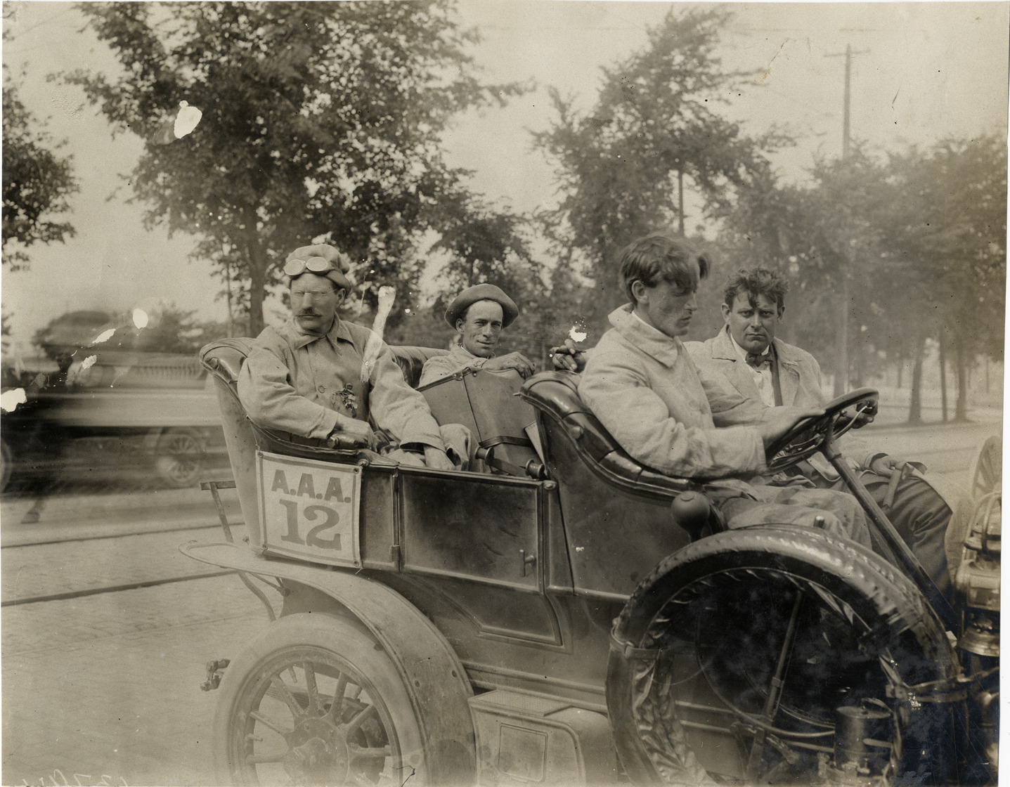 Close-up view of driver and passengers in car no. 12 at Quebec City during the 1906 Glidden Tour. Stamped on back: "F. Ed. Spooner, and Chas. S. Wells. Motor News, Motor Photos, Motor Adv, 1536 B'way, New York. Tel 6536-38th St." Handwritten on back: "Tours--Glidden Tour, 1906."