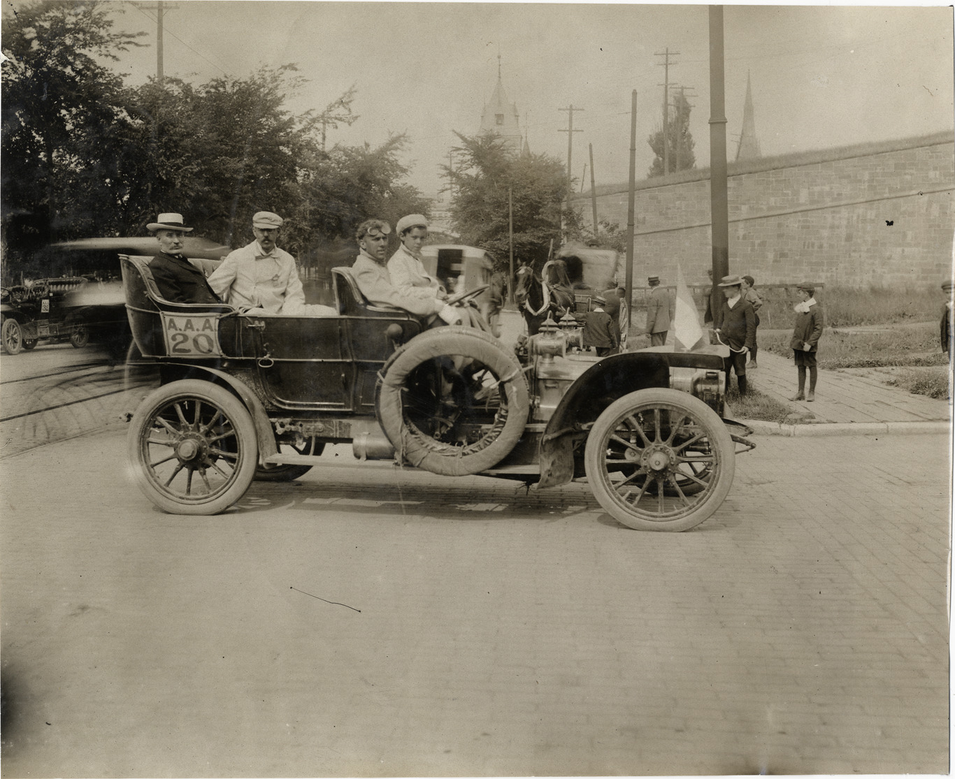 View of driver and passengers in car no. 20 at Quebec City during the 1906 Glidden Tour. Stone wall in background. Stamped on back: "F. Ed. Spooner, and Chas. S. Wells. Motor News, Motor Photos, Motor Adv, 1536 B'way, New York. Tel 6536-38th St." Handwritten on back: "Tours--Glidden Tour, 1906."