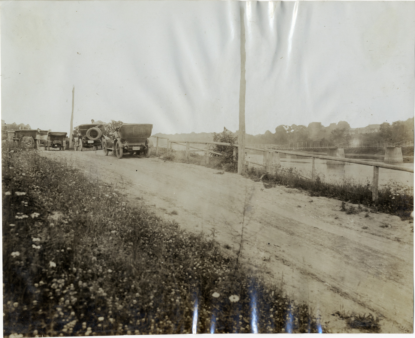 Favorite this☆ Automobiles parked on road along river, 1906 Glidden Tour Description: View of cars parked on dirt road along river during the 1906 Glidden Tour. Bridge in background. Handwritten on back: "Tours--Glidden Tour, 1906." Details Resource ID: na022307 Subject: Automobiles Rural roads Glidden Tour (1906) Automobile driving--Competitions Photographic prints Date Issued: 1906-07 Format: 1 photographic print ; 7.75 x 9.5 in. Member of: National Automotive History Collection Lazarnick Collection Filing Location: Tours--Glidden Tour, 1906 #45 Rights: Physical rights are retained by DPL. Copyright is retained in accordance with U.S. copyright laws.