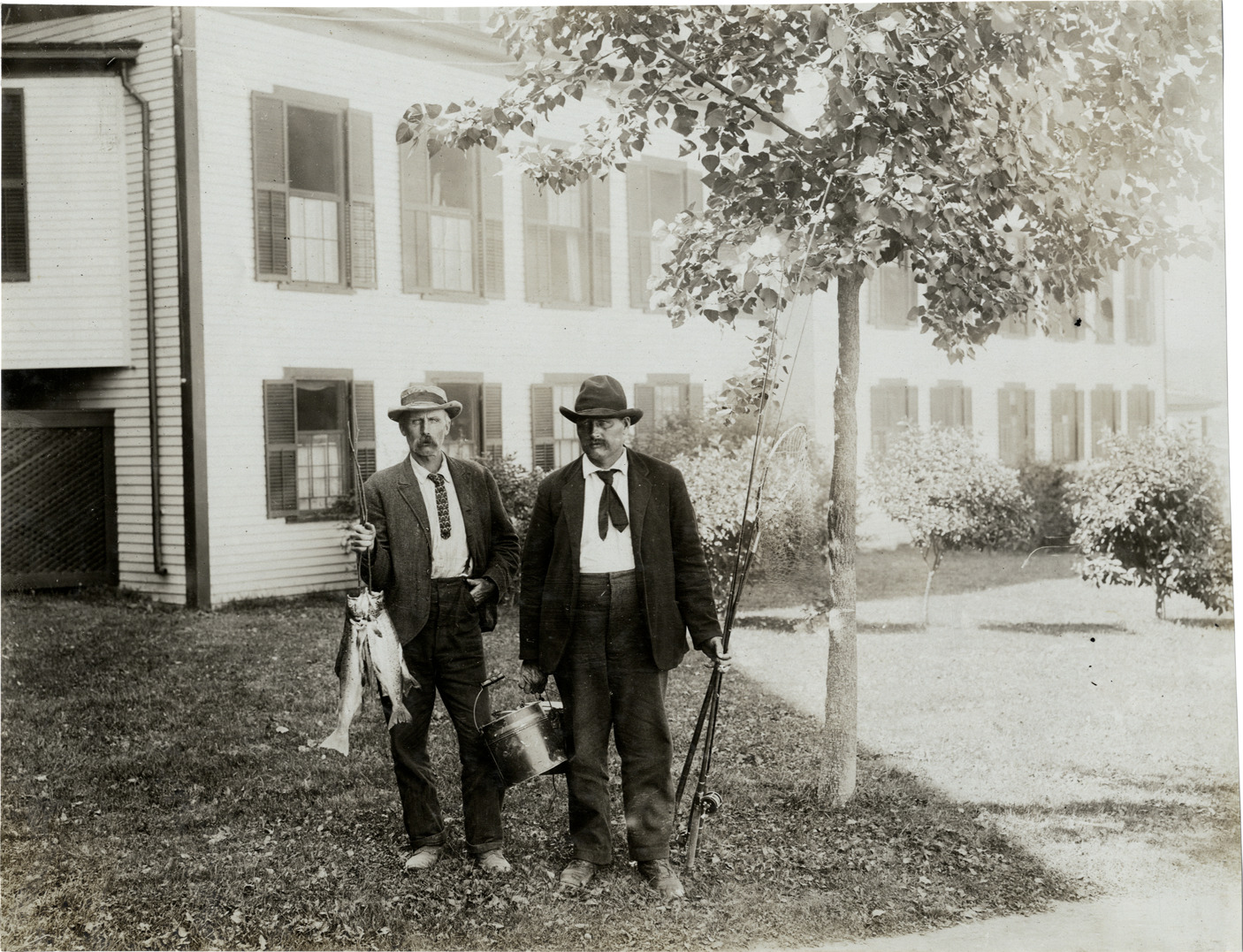 Favorite this☆ Fishermen, 1906 Glidden Tour Description: View of two men posing with fish, bucket and fishing poles in front of hotel during the 1906 Glidden Tour. Handwritten on back: "Tours--Glidden Tour, 1906." Details Resource ID: na022313 Subject: Fishers Fishes Fishing rods Glidden Tour (1906) Automobile driving--Competitions Photographic prints Date Issued: 1906-07 Format: 1 photographic print ; 7.25 x 9.25 in. Member of: National Automotive History Collection Lazarnick Collection Filing Location: Tours--Glidden Tour, 1906 #46 Rights: Physical rights are retained by DPL. Copyright is retained in accordance with U.S. copyright laws.