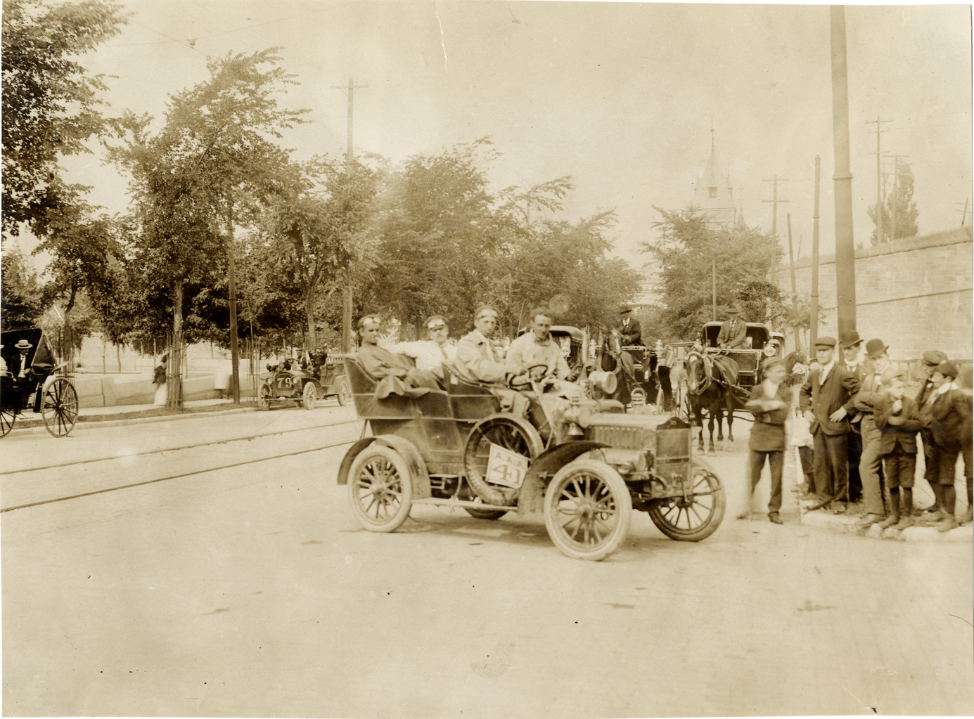 View of driver and passengers in car no. 41 at Quebec City during the 1906 Glidden Tour. Horse-drawn carriages and group of spectators in background. Stamped on back: "F. Ed. Spooner, and Chas. S. Wells. Motor News, Motor Photos, Motor Adv, 1536 B'way, New York. Tel 6536-38th St." Handwritten on back: "Tours--Glidden Tour, 1906."