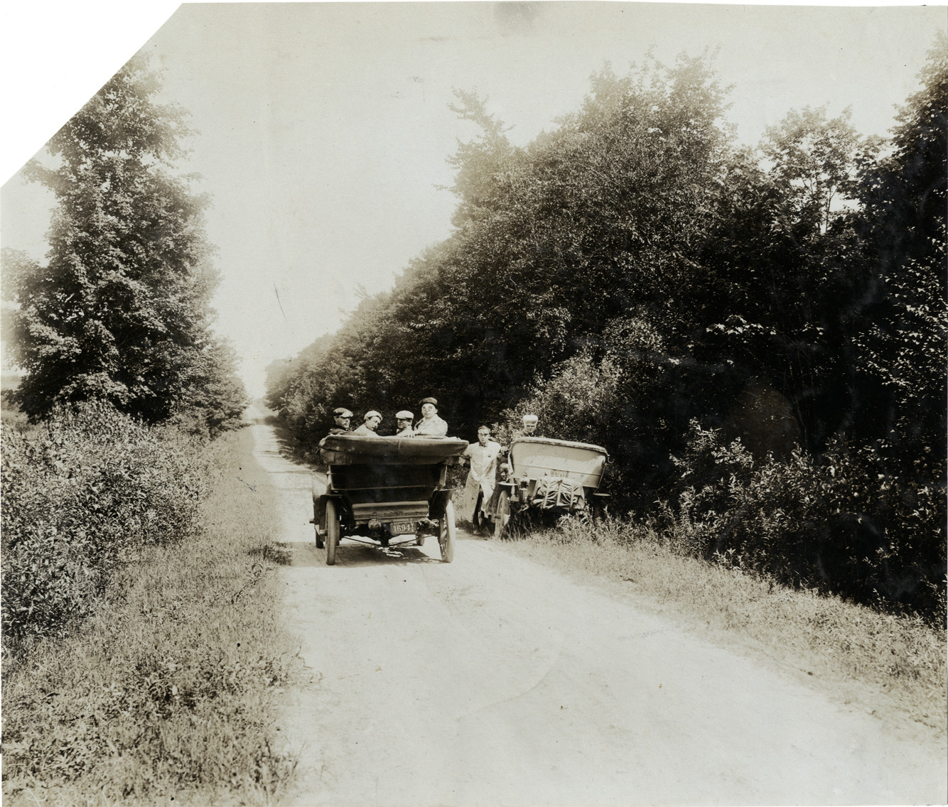 Favorite this☆ Motorists in automobiles on rural road, 1906 Glidden Tour Description: Rear view of motorists in two cars on rural dirt road during the 1906 Glidden Tour. Handwritten on back: "Tours--Glidden Tour, 1906." Details Resource ID: na022333 Subject: Automobiles Rural roads Glidden Tour (1906) Automobile driving--Competitions Photographic prints Date Issued: 1906-07 Format: 1 photographic print ; 7.5 x 9 in. Member of: National Automotive History Collection Lazarnick Collection Filing Location: Tours--Glidden Tour, 1906 #46 Rights: Physical rights are retained by DPL. Copyright is retained in accordance with U.S. copyright laws.