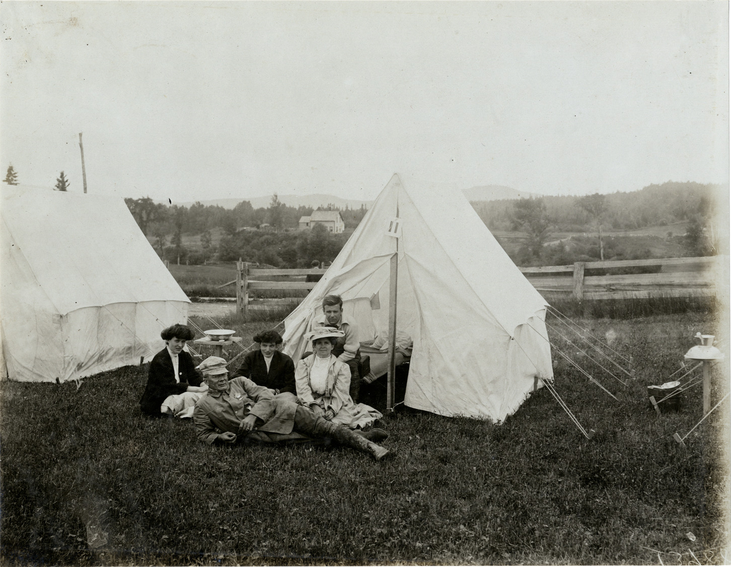 Men and women posing in front of tent, Jackman, Maine, 1906 Glidden Tour