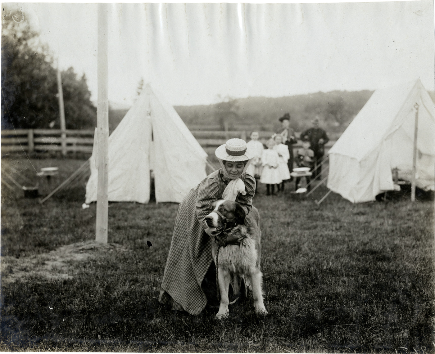 View of Mrs. Georges DuPuy with dog at Jackman, Maine during the 1906 Glidden Tour. Tents in background. Handwritten on back: "Mrs. Geo. DuPuy found a dog at Jackman that spoke only French. Tours--Glidden Tour, 1906."