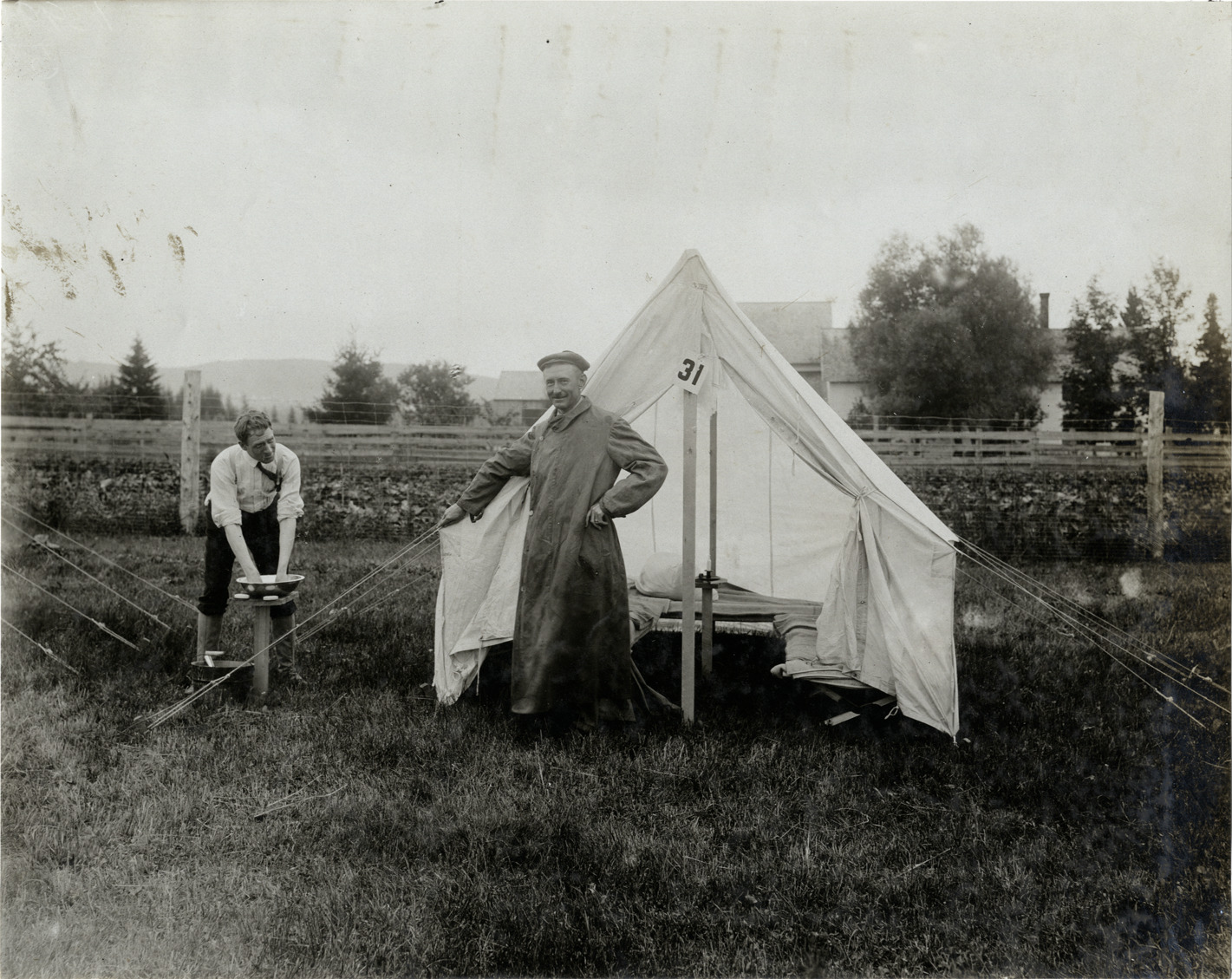View of two men standing in front of tent no. 31 at Jackman, Maine during the 1906 Glidden Tour. One man washes his hands in basin. Handwritten on back: "Tours--Glidden Tour, 1906."