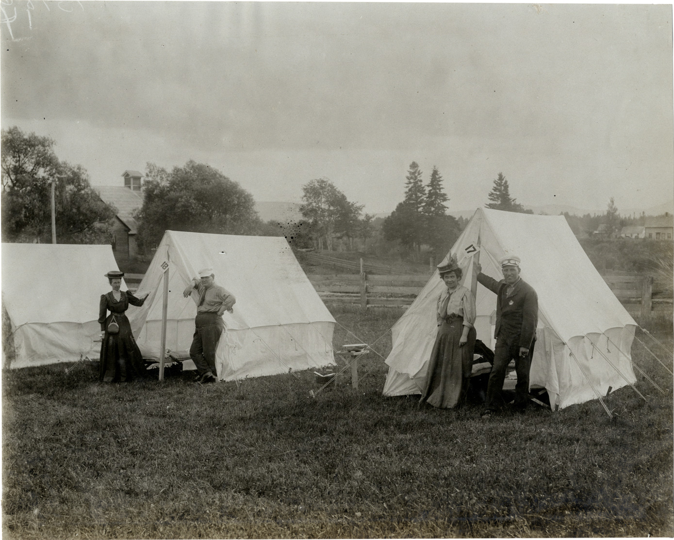 Favorite this☆ Couples posing in front of tents, Jackman, Maine, 1906 Glidden Tour Description: View of two couples posing in front of tent no. 17 and tent no. 18 at Jackman, Maine during the 1906 Glidden Tour. Handwritten on back: "Tours--Glidden Tour, 1906." Details Resource ID: na022352 Subject: Tents--Maine--Jackman Glidden Tour (1906) Automobile driving--Competitions Photographic prints Date Issued: 1906-07 Format: 1 photographic print ; 7.5 x 9.25 in. Member of: National Automotive History Collection Lazarnick Collection Filing Location: Tours--Glidden Tour, 1906 #47 Rights: Physical rights are retained by DPL. Copyright is retained in accordance with U.S. copyright laws.