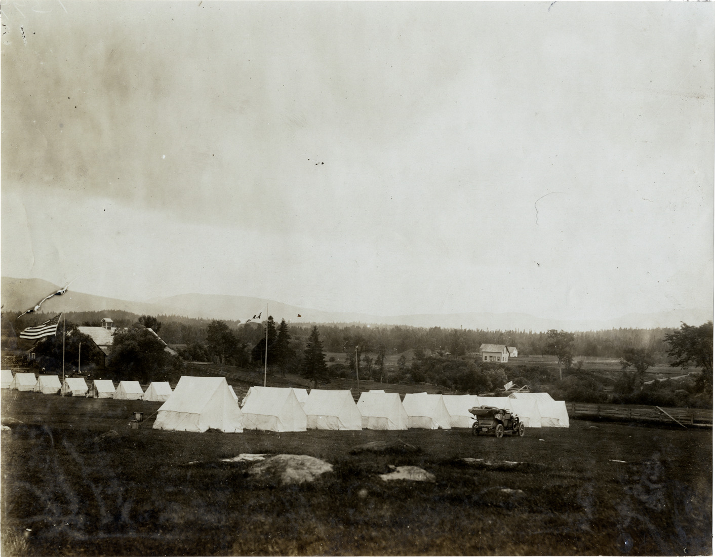 Automobile and tents in field, Jackman, Maine, 1906 Glidden Tour