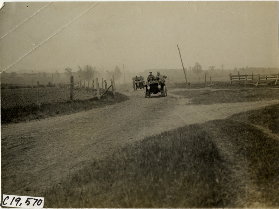 View of motorists in two cars traveling on rural dirt road during the pathfinding expedition for the 1906 Glidden Tour. Stamped on back: "Photo by N. Lazarnick, 29 West 42nd Street, New York." Handwritten on back: "Tours--Glidden Tour Pathfinder, 1906."