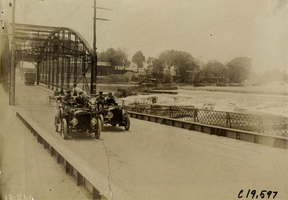 View of motorists in two cars crossing bridge at Glens Falls, New York during the pathfinding expedition for the 1906 Glidden Tour. Waterfall on right. Handwritten on back: "Tours--Glidden Tour Pathfinder, 1906."