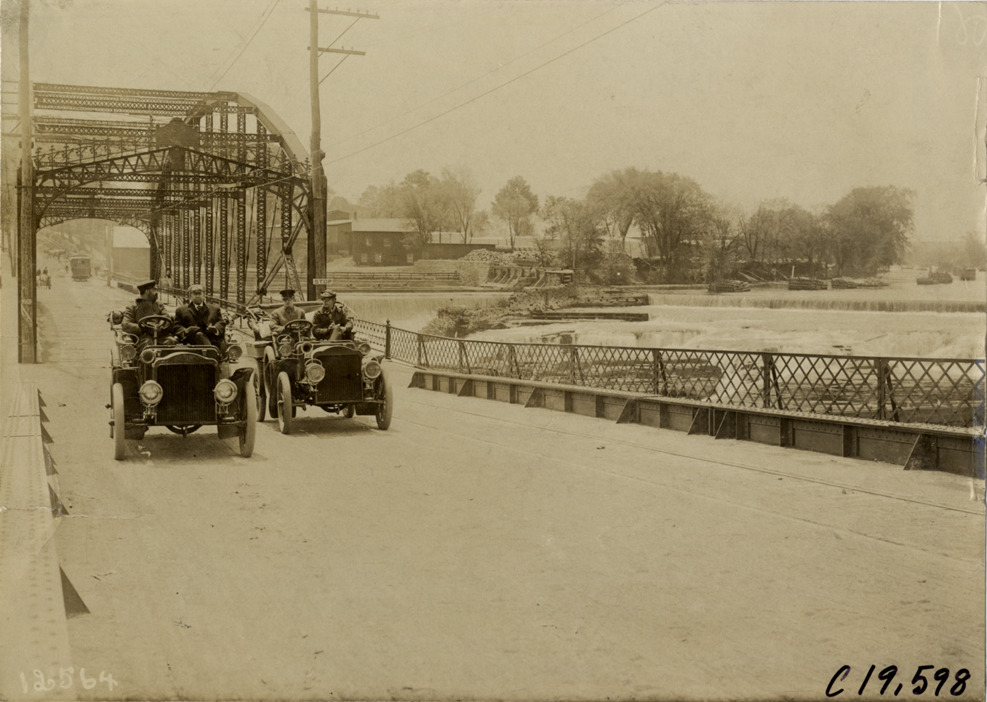 View of motorists in two cars crossing bridge at Glens Falls, New York during the pathfinding expedition for the 1906 Glidden Tour. Waterfall on right. Handwritten on back: "Tours--Glidden Tour Pathfinder, 1906."