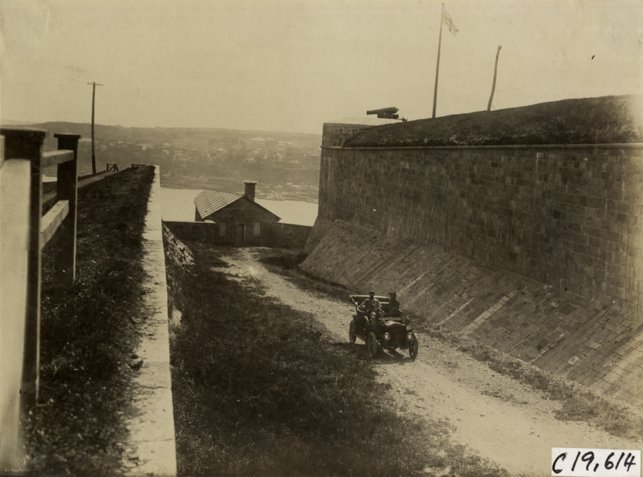 Motorists in automobile traveling next to Quebec Citadel, 1906 Glidden pathfinding expedition