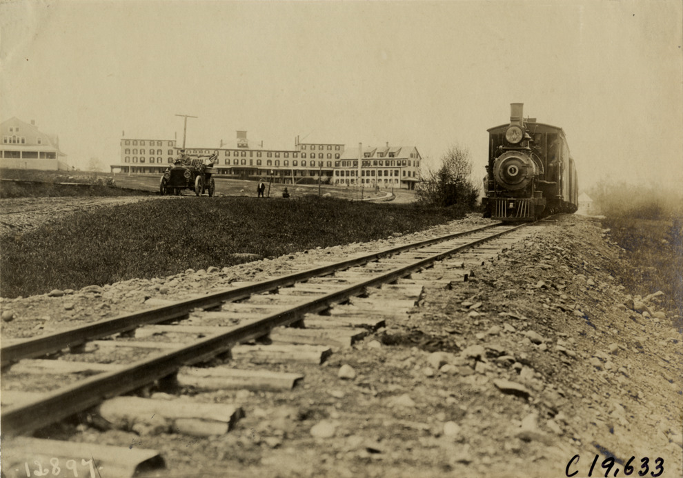 View of train approaching on tracks at Rangeley, Maine during the pathfinding expedition for the 1906 Glidden Tour. Automobile is parked on road; Rangeley Lake House in background. Handwritten on back: "Tours--Glidden Tour Pathfinder, 1906."