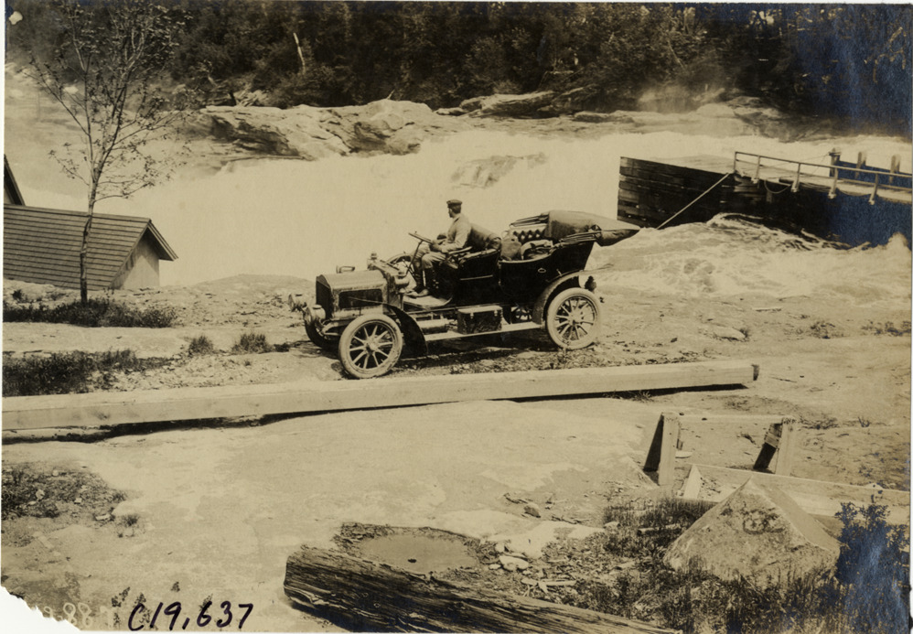 Driver in automobile overlooking rapids, 1906 Glidden pathfinding expedition