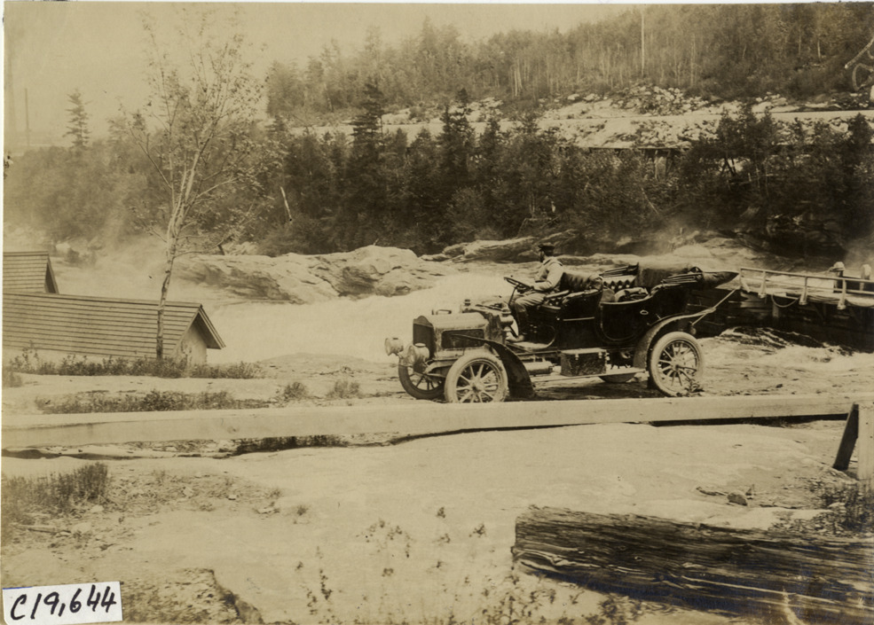 Driver in automobile overlooking rapids, 1906 Glidden pathfinding expedition
