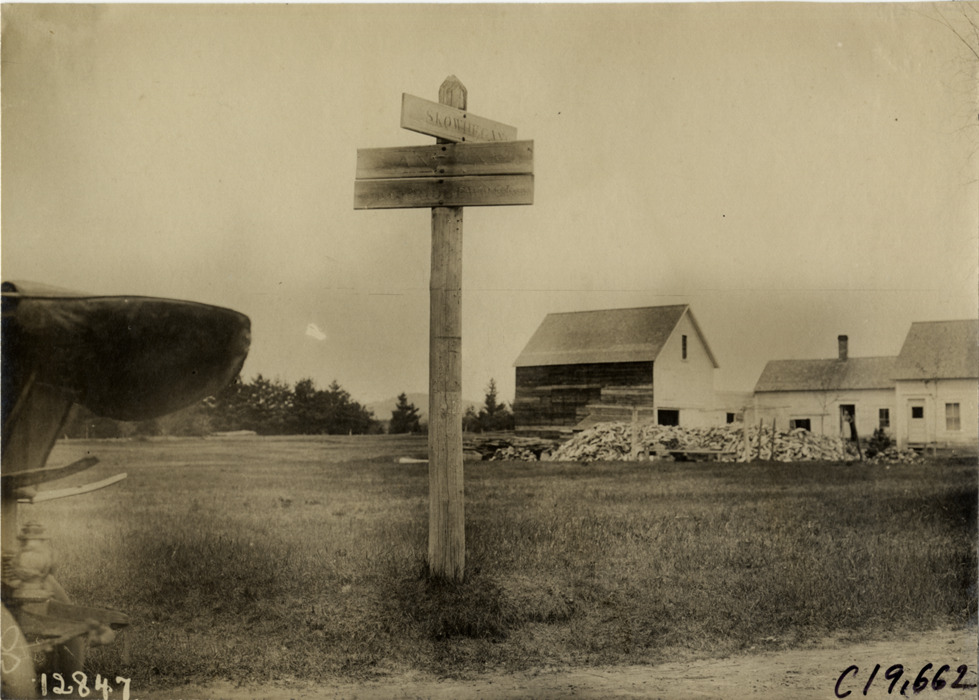 View of signpost in Maine during the pathfinding expedition for the 1906 Glidden Tour. "Skowhegan" is printed on board at top of post; farm buildings in background. Handwritten on back: "Tours--Glidden Tour Pathfinder, 1906."