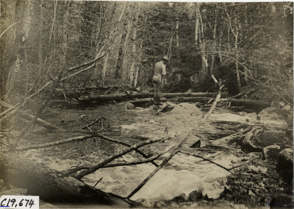Man fishing in stream, 1906 Glidden pathfinding expedition