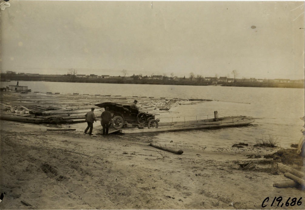 Automobile on flatboat, 1906 Glidden pathfinding expedition