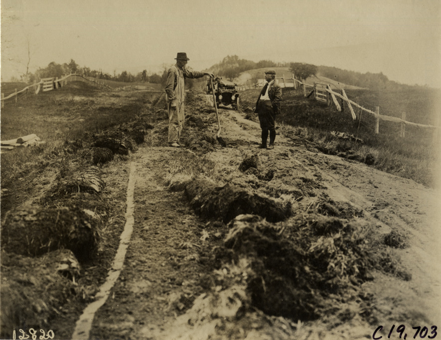 Motorist speaking with road construction worker, 1906 Glidden pathfinding expedition