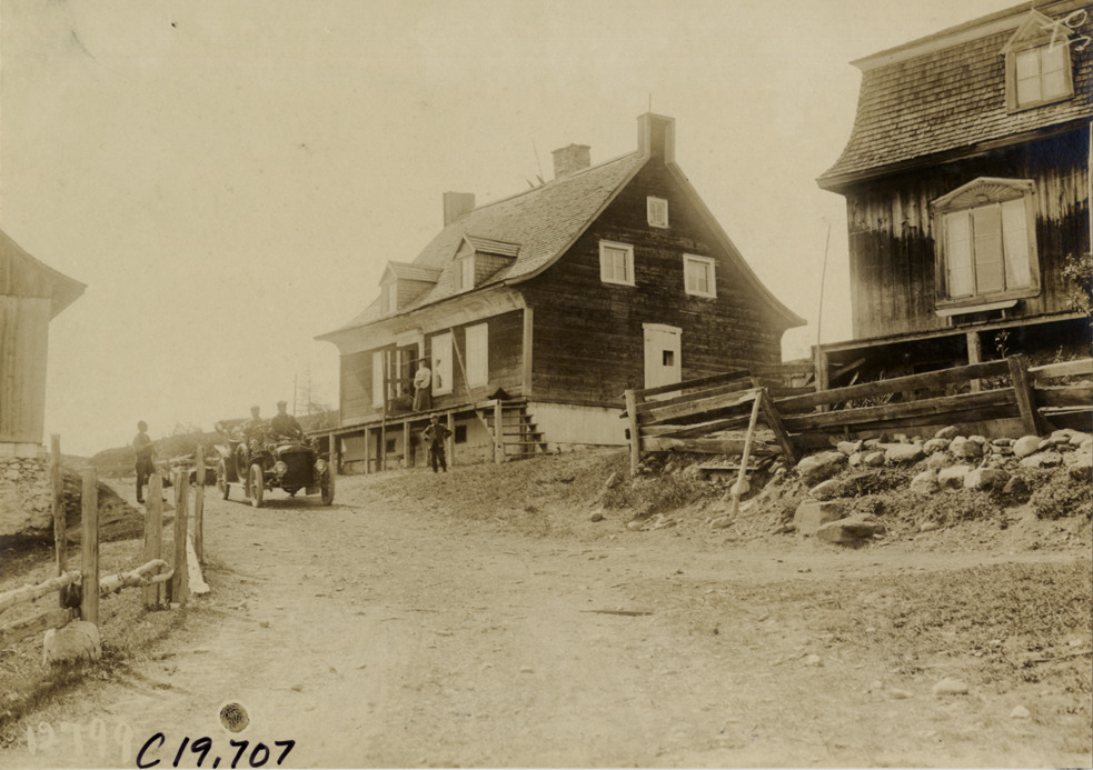 Motorists in automobile passing wooden-frame house, 1906 Glidden pathfinding expedition