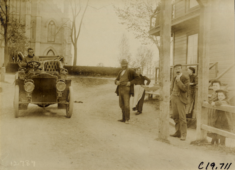 View of driver in car passing group of men, women and children during the pathfinding expedition for the 1906 Glidden Tour. Handwritten on back: "Tours--Glidden Tour Pathfinder, 1906."