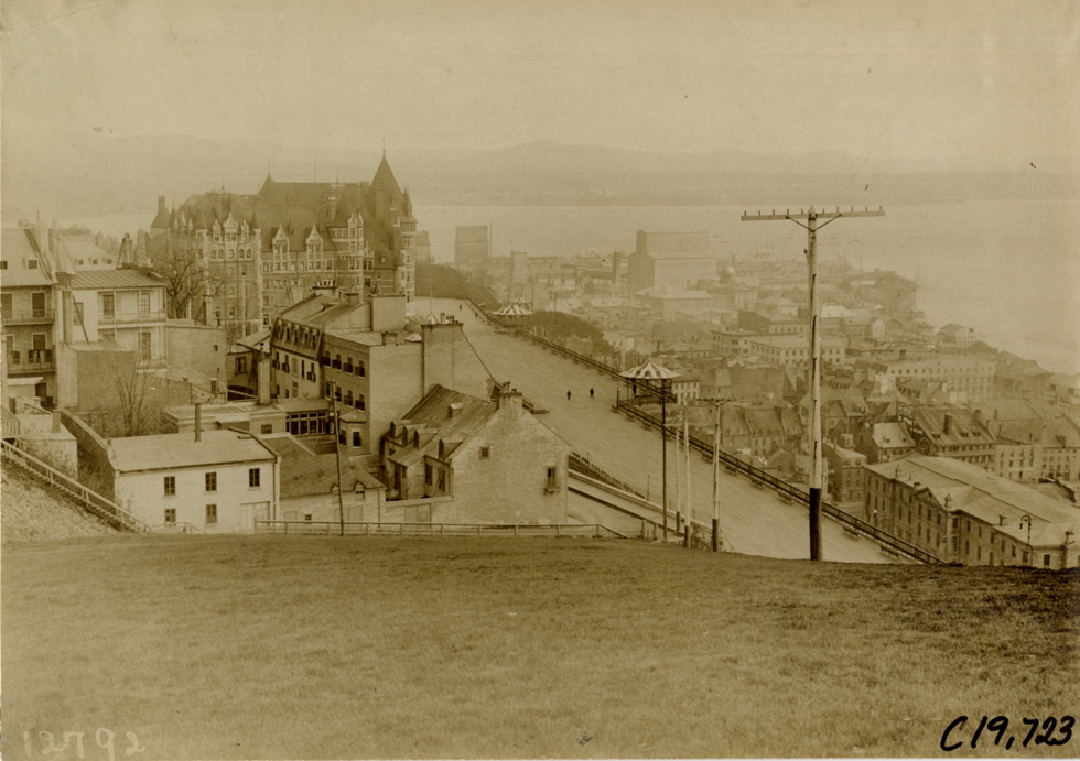 Bird's-eye view of Quebec City waterfront and St. Lawrence River during the pathfinding expedition for the 1906 Glidden Tour. Handwritten on back: "Tours--Glidden Tour Pathfinder, 1906."