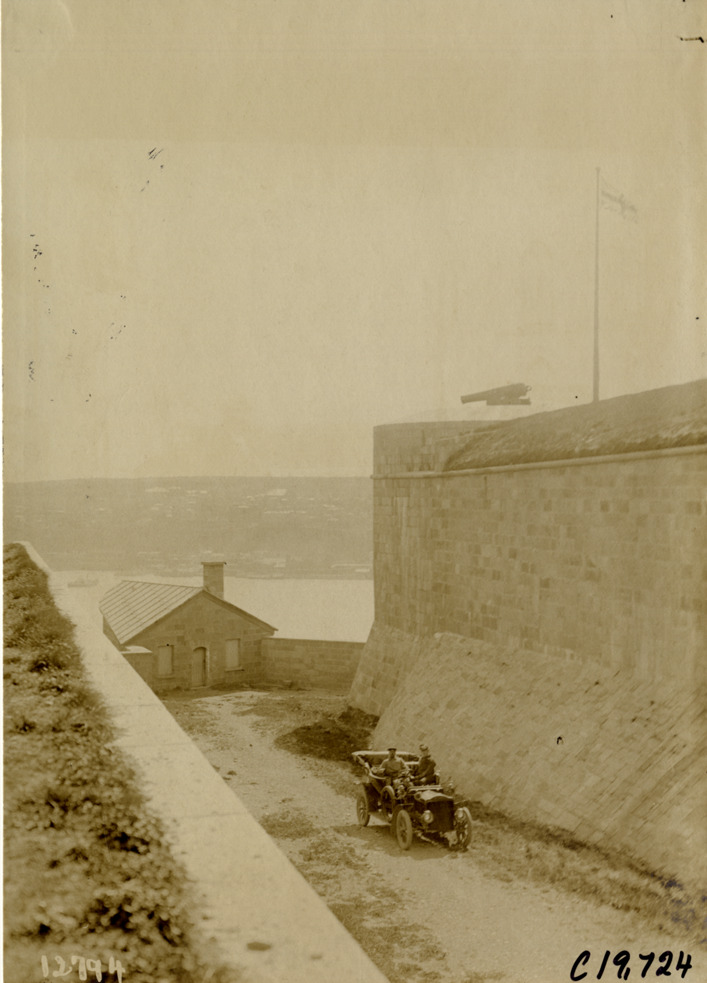 Motorists in automobile inside Quebec Citadel, 1906 Glidden pathfinding expedition